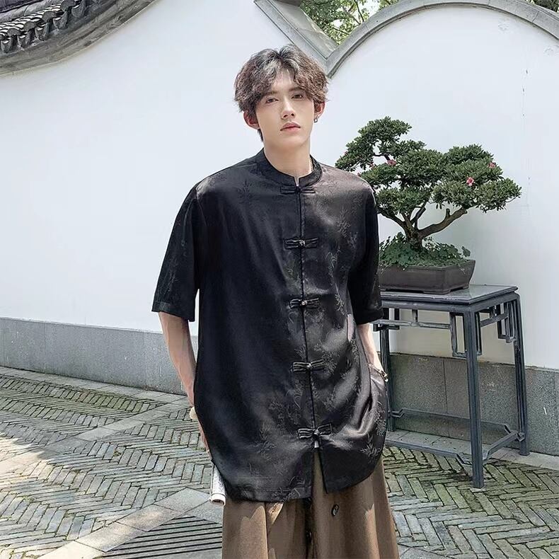 【之】★シャツ★ブラック イェロー ブルー カジュアル ファッション 結び目ボタン 竹 | 之