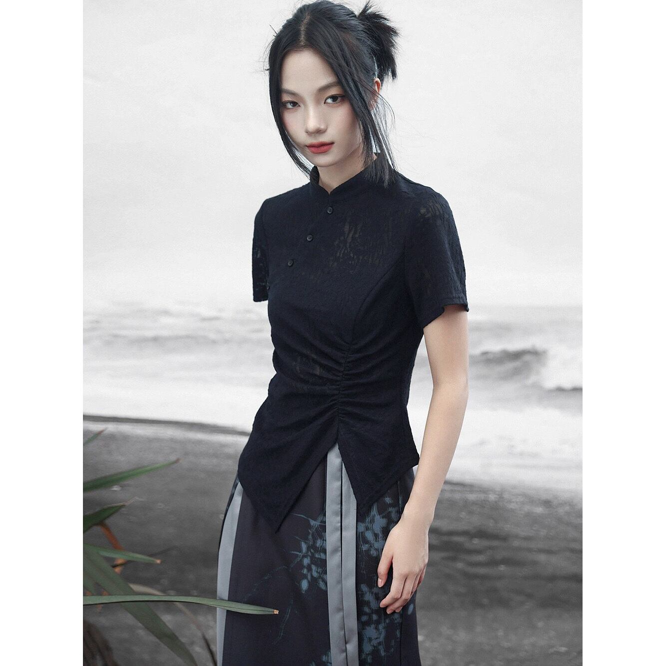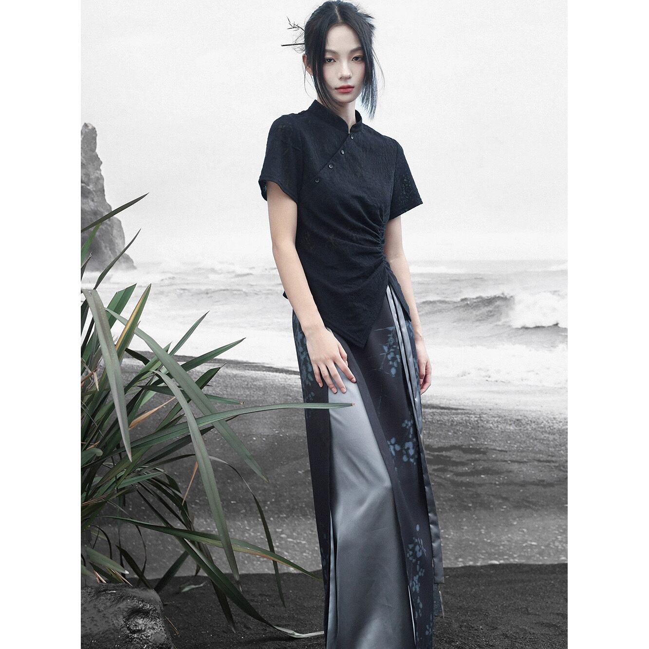 ◇迷途◇【之x大青龍肆】★Tシャツ★ブラック 結びボタン チャイナ レディース