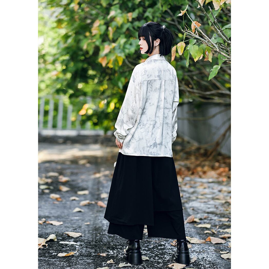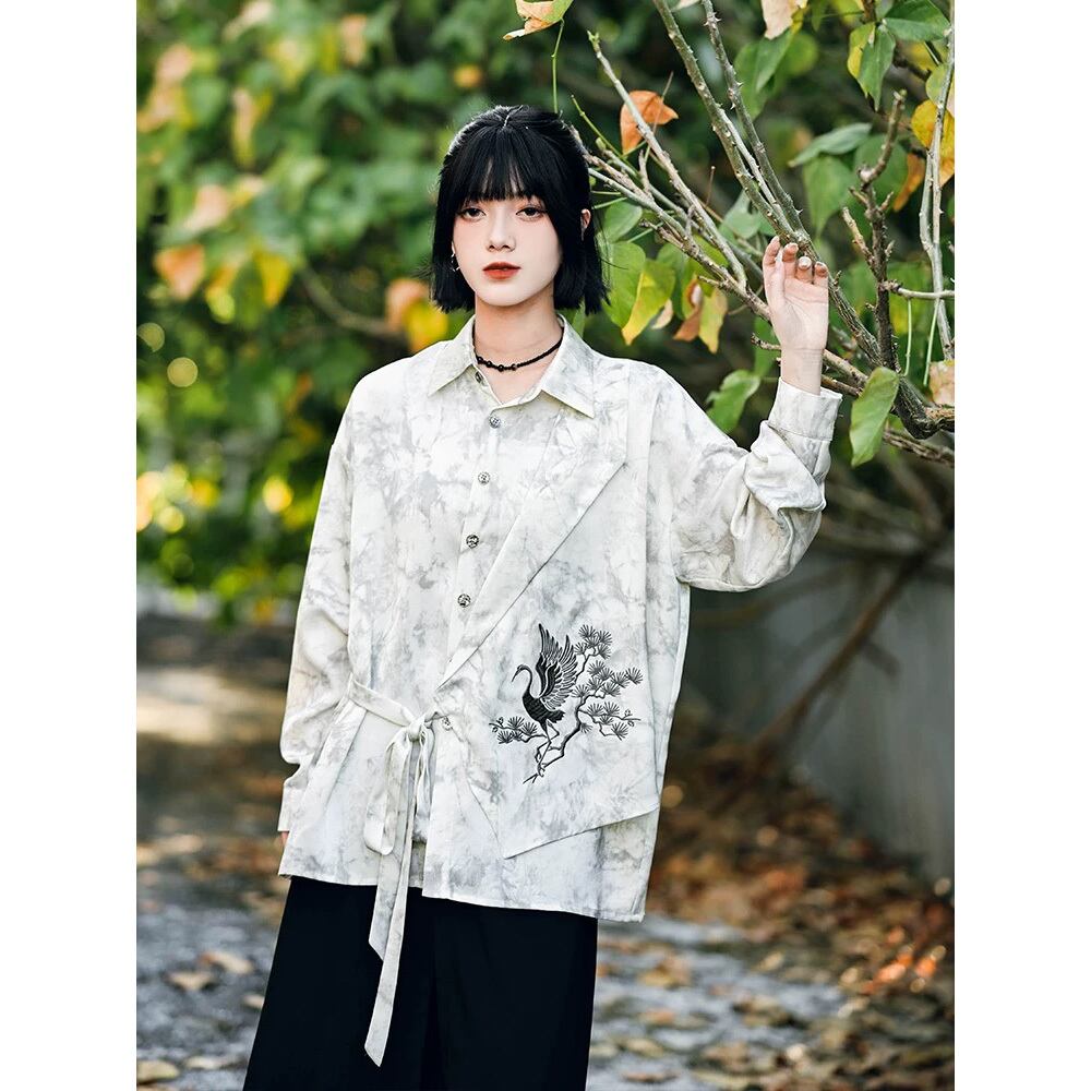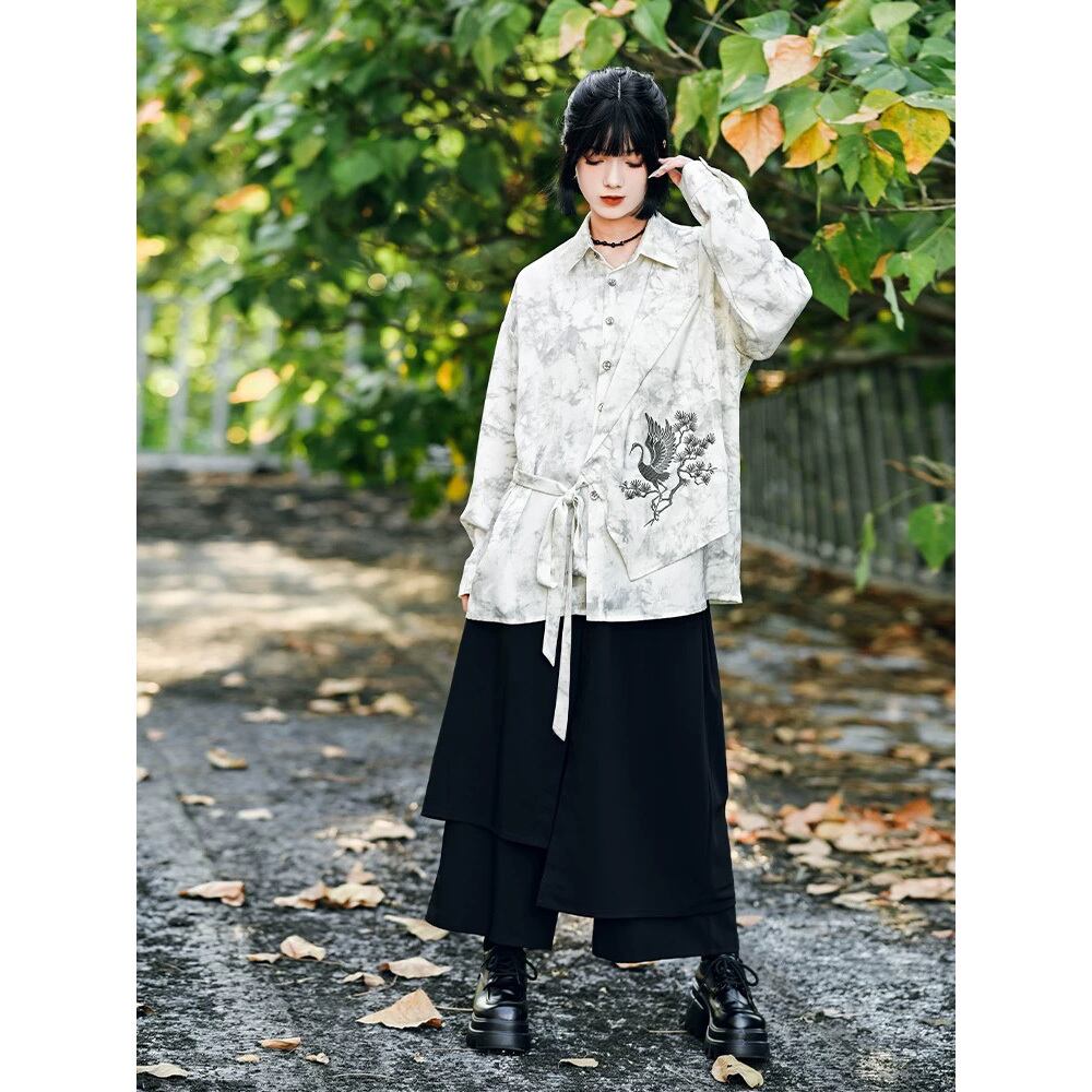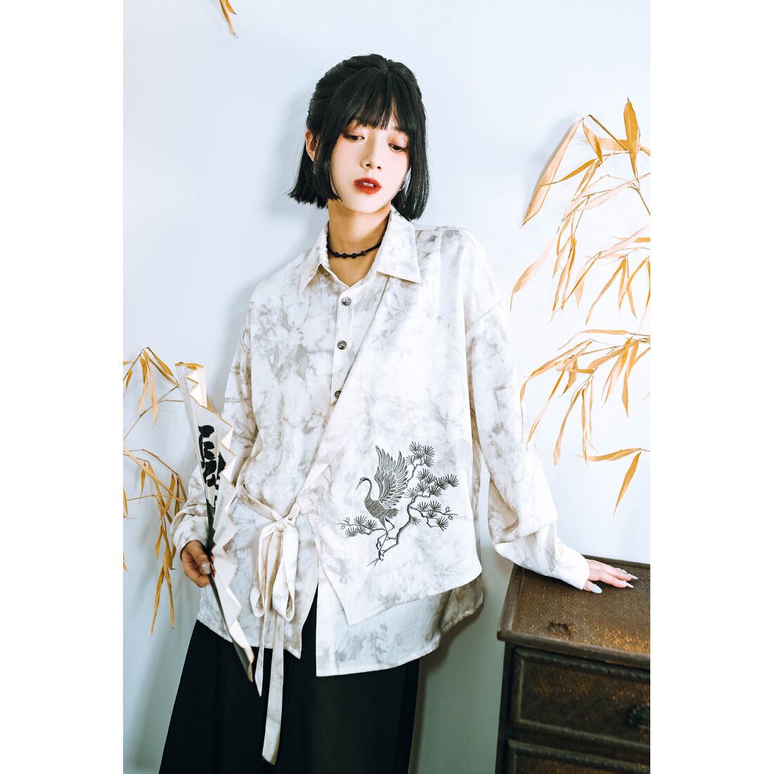 【之x古怪舎】★シャツ・尋鶴★ブラック ホワイト 刺繍 チャイナ