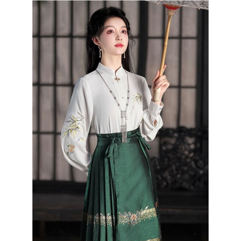 【之】★シャツ★ホワイト 刺繍 チャイナ 結びボタン スタンドネック | 之