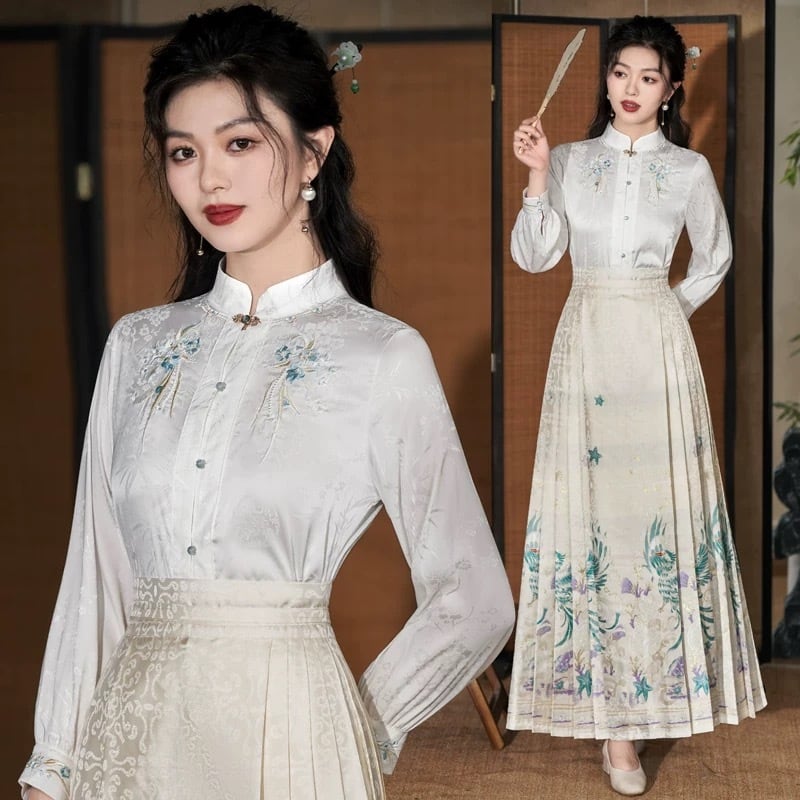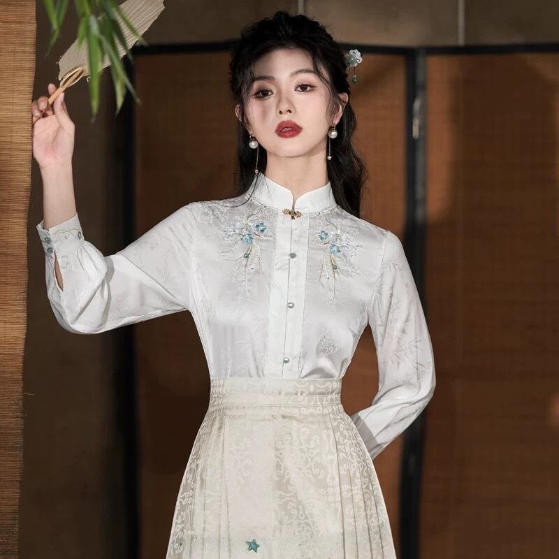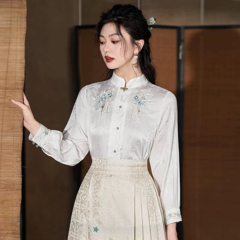 【之】★シャツ★ホワイト チャイナ 刺繍 結びボタン スタンドネック