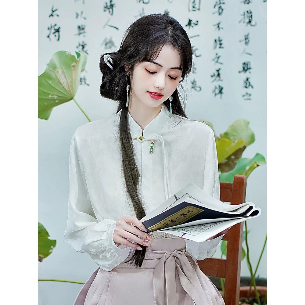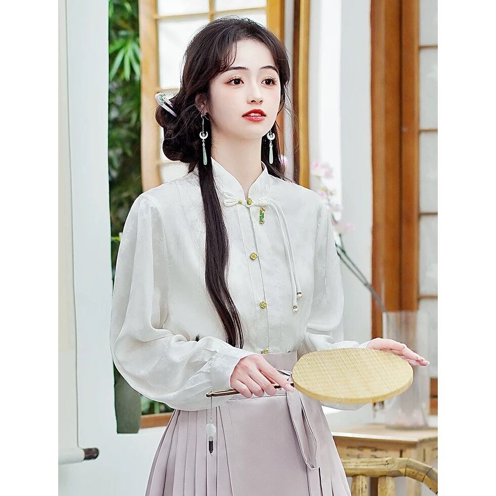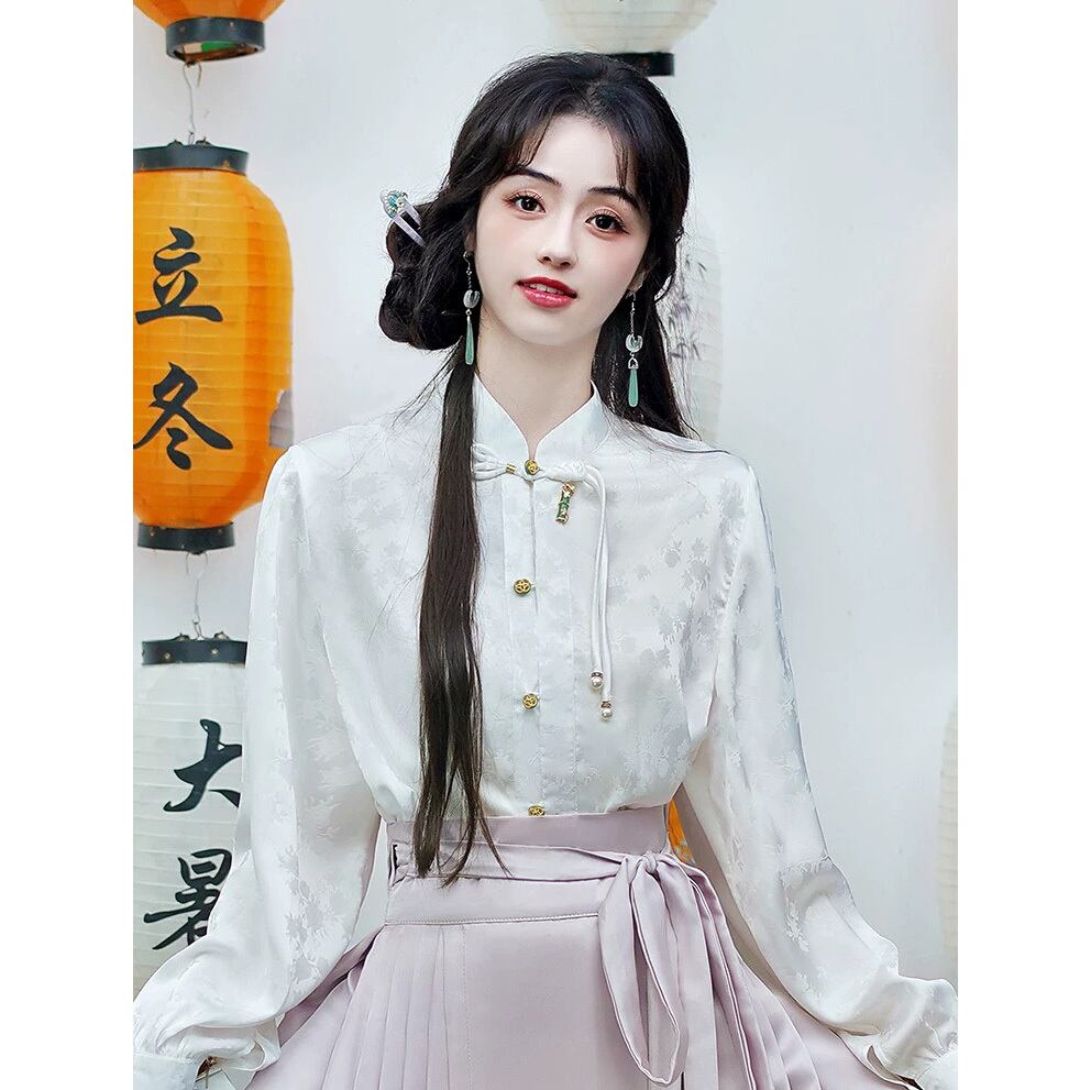 【之】★シャツ★ホワイト チャイナ 刺繍 結びボタン スタンドネック