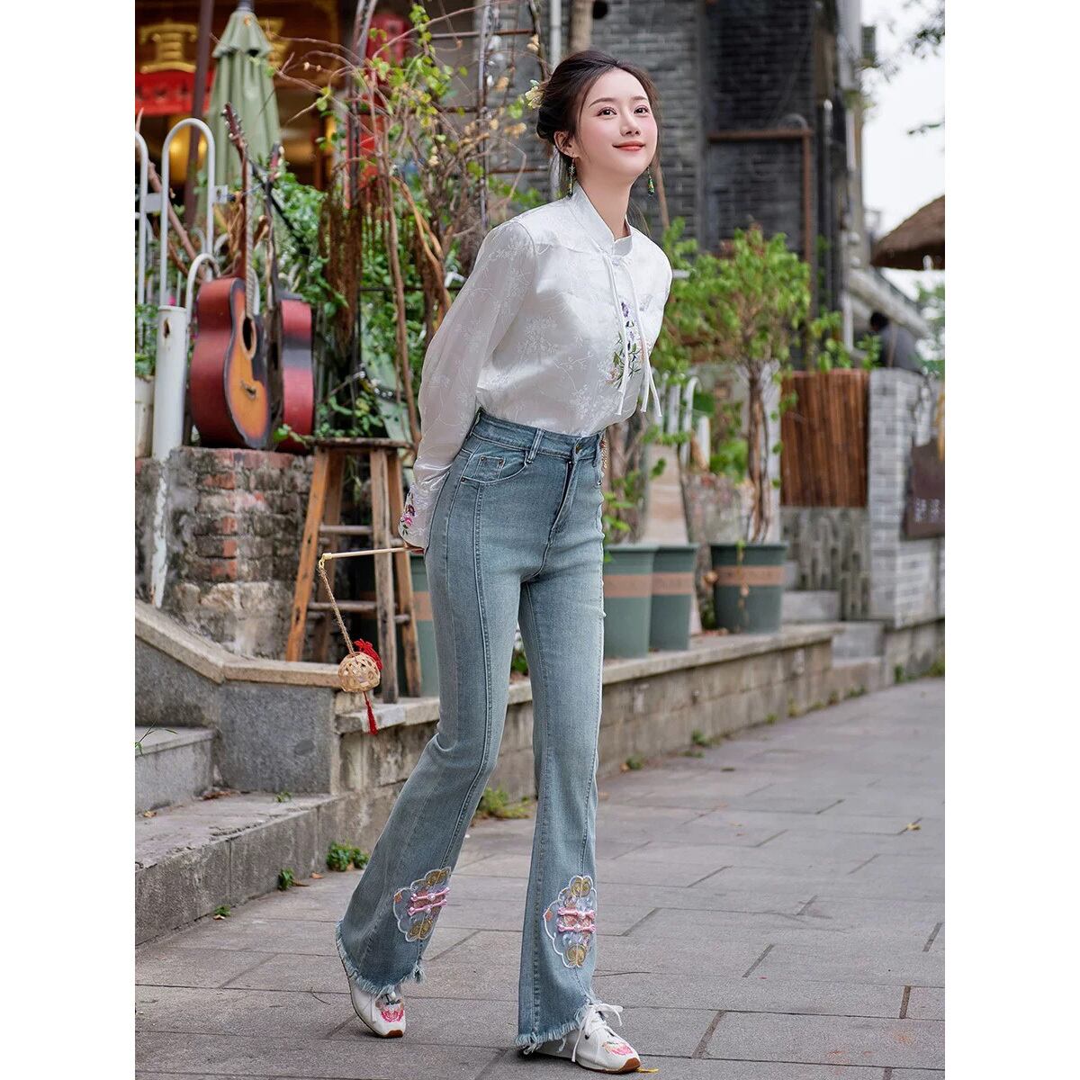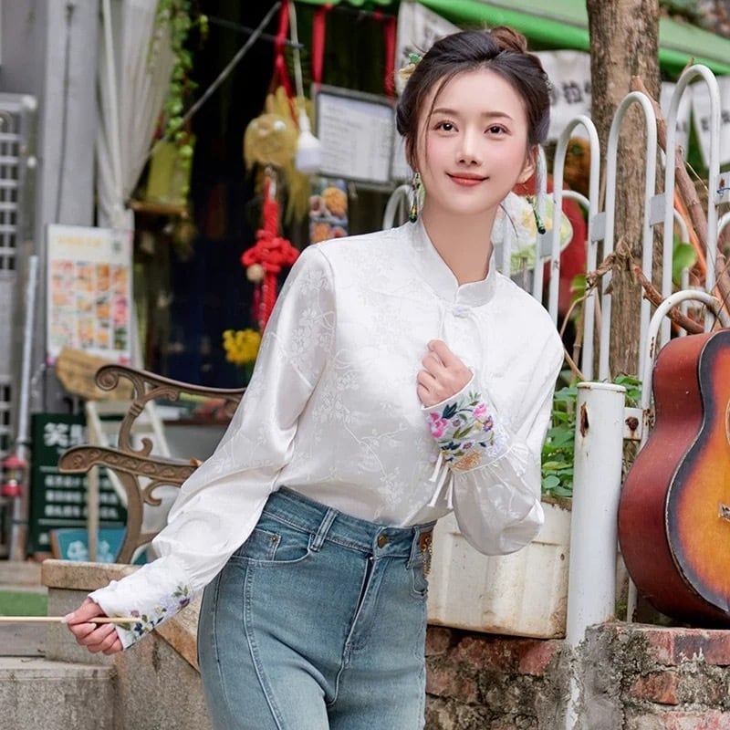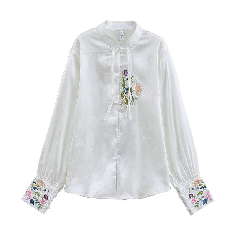【之】★シャツ★ホワイト チャイナ 刺繍 結びボタン スタンドネック