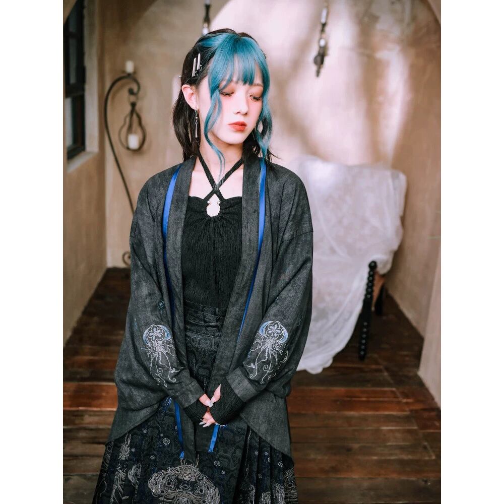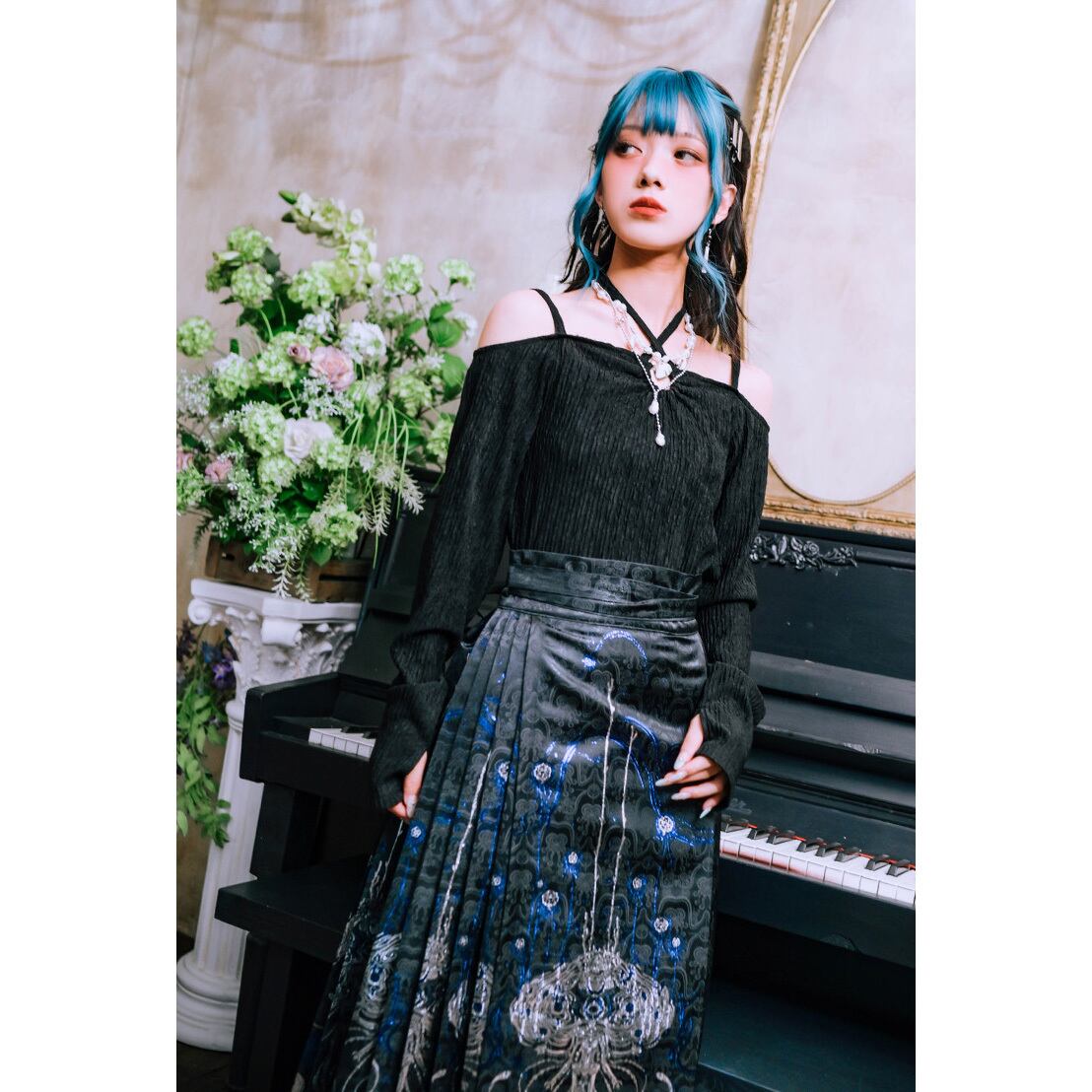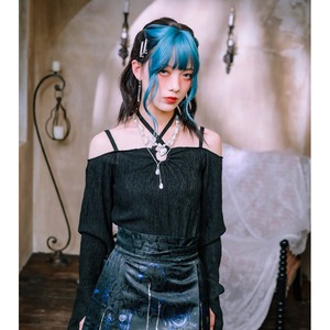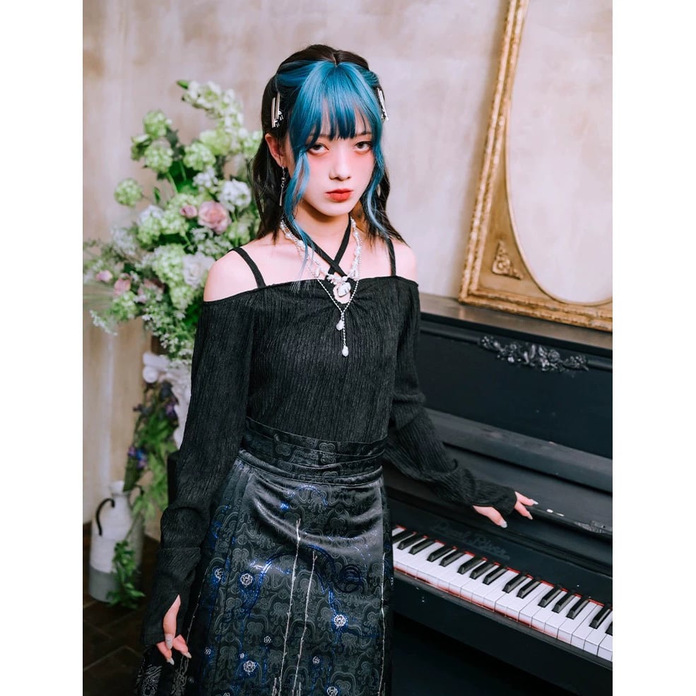 【之x古怪舎】★Tシャツ・暮影★ブラック ワンショル オープンショルダー チャイナ
