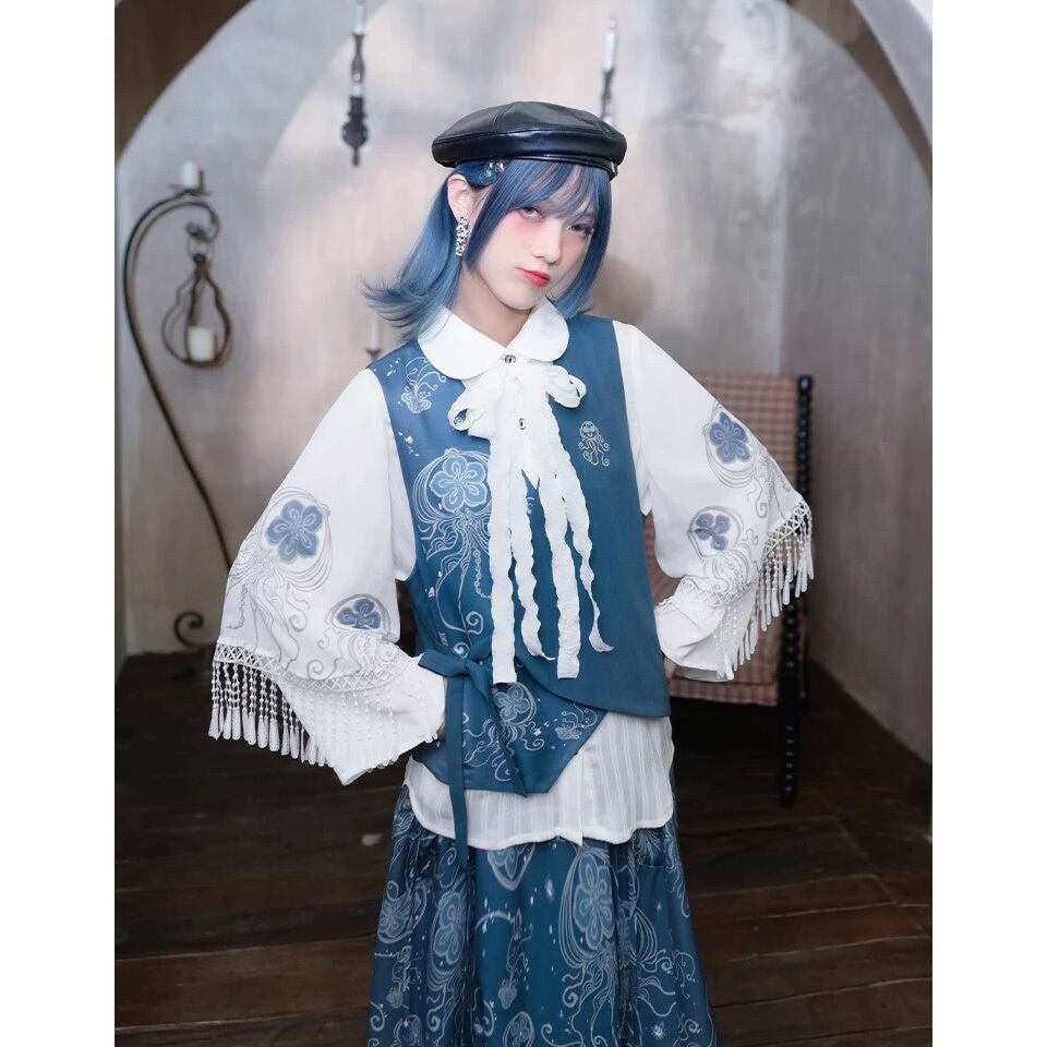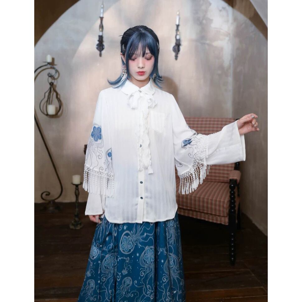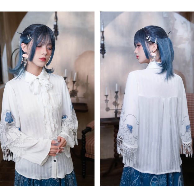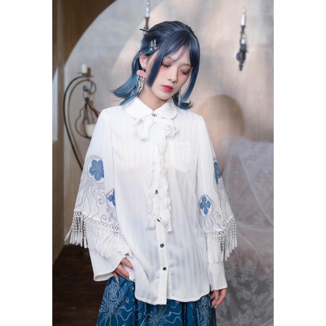 【之x古怪舎】★シャツ・青涙★ホワイト チャイナ タッセル 通勤 高級 レース