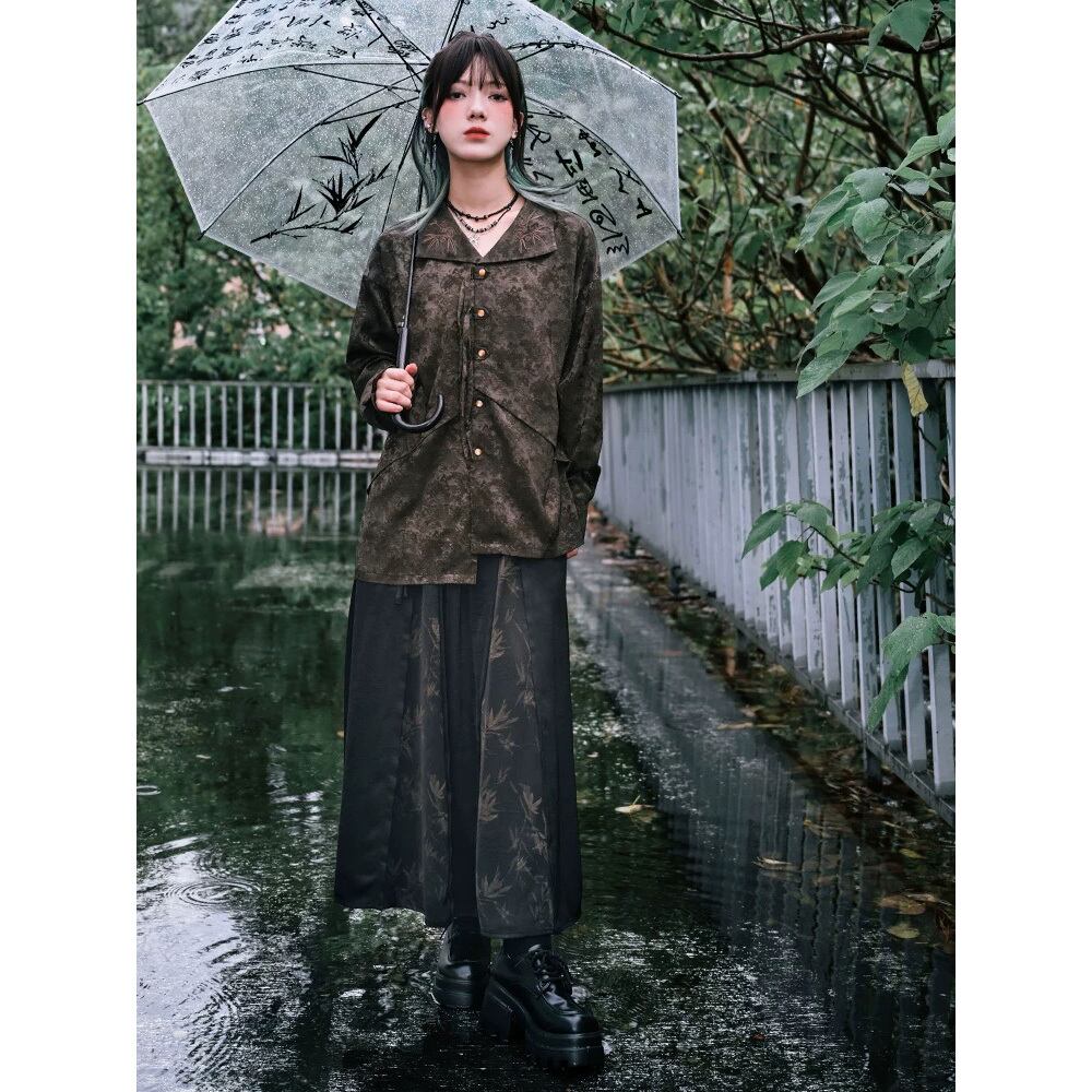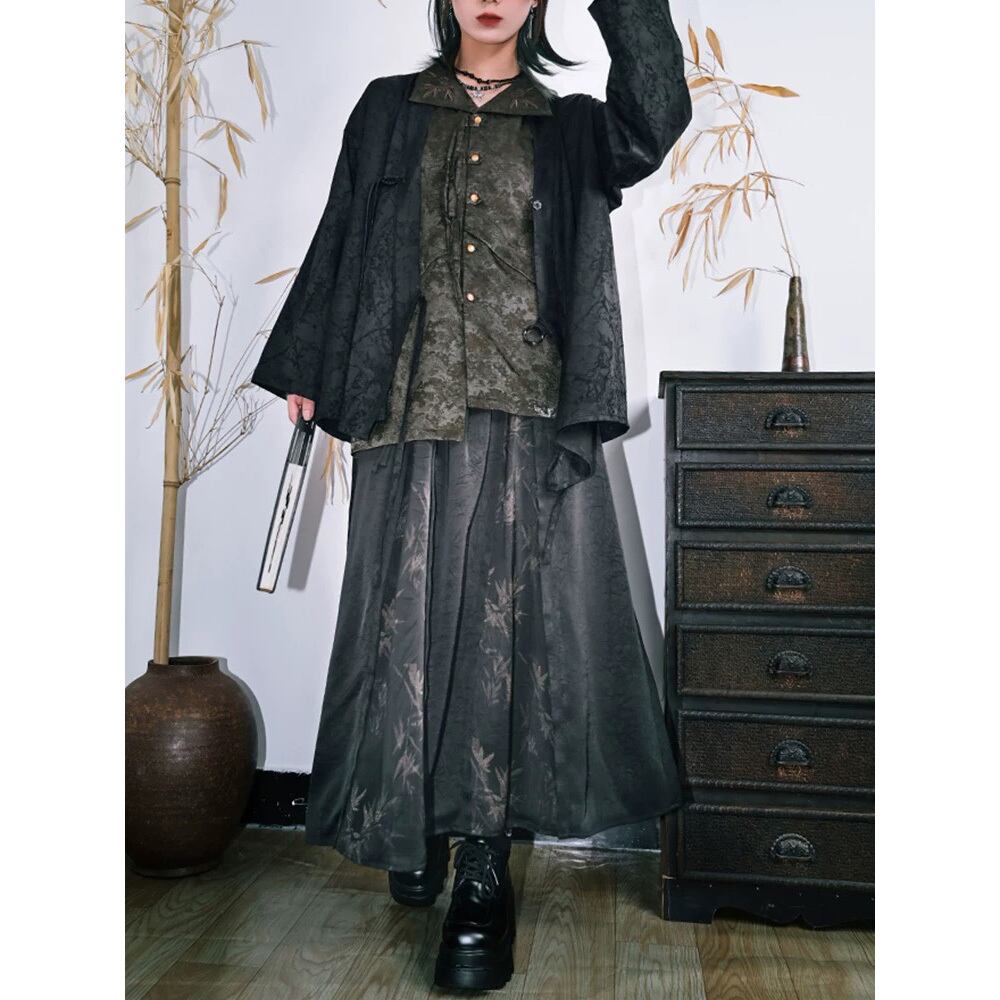 【之x古怪舎】★スカート・竹影★ブラック チャイナ ロング プリント