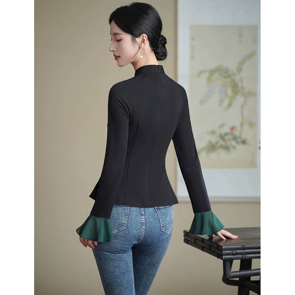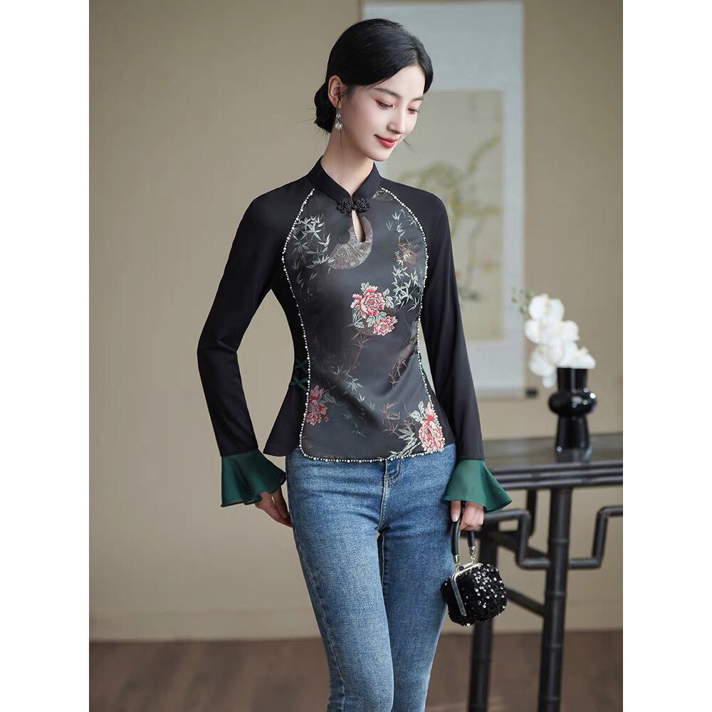 【之】★Tシャツ★ブラック チャイナ 中華服 結びボタン プリント レディース服